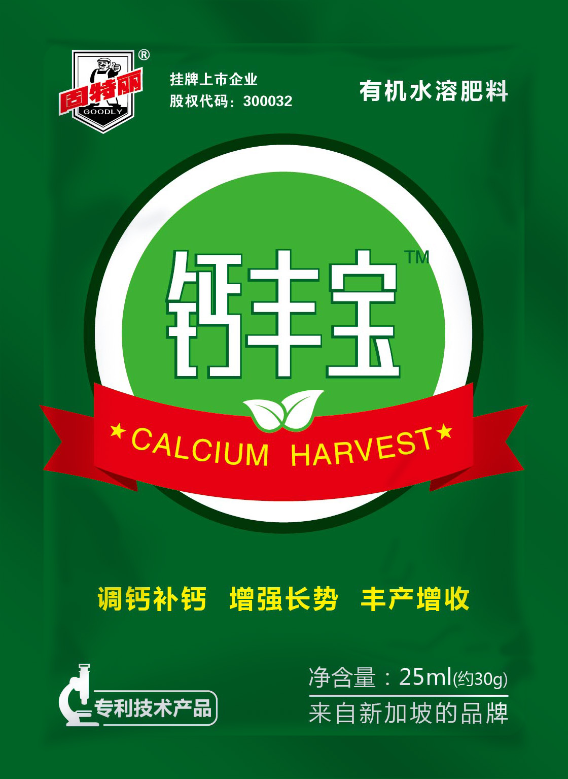 6、本品富含双重补钙调钙通道,喷于果实的钙素可以通过果面吸收进入果实中,也可将土壤、根部、叶片中的丰富的钙源通过韧皮部及果柄输运到果实上(调节叶片上的钙向果实当中转移),外源补钙与内源调钙相结合,在茄果类、根茎类蔬菜和各种瓜果上表现出了长久的补钙效果。是唯一可以在果实套袋后继续使用的叶面钙肥产品。