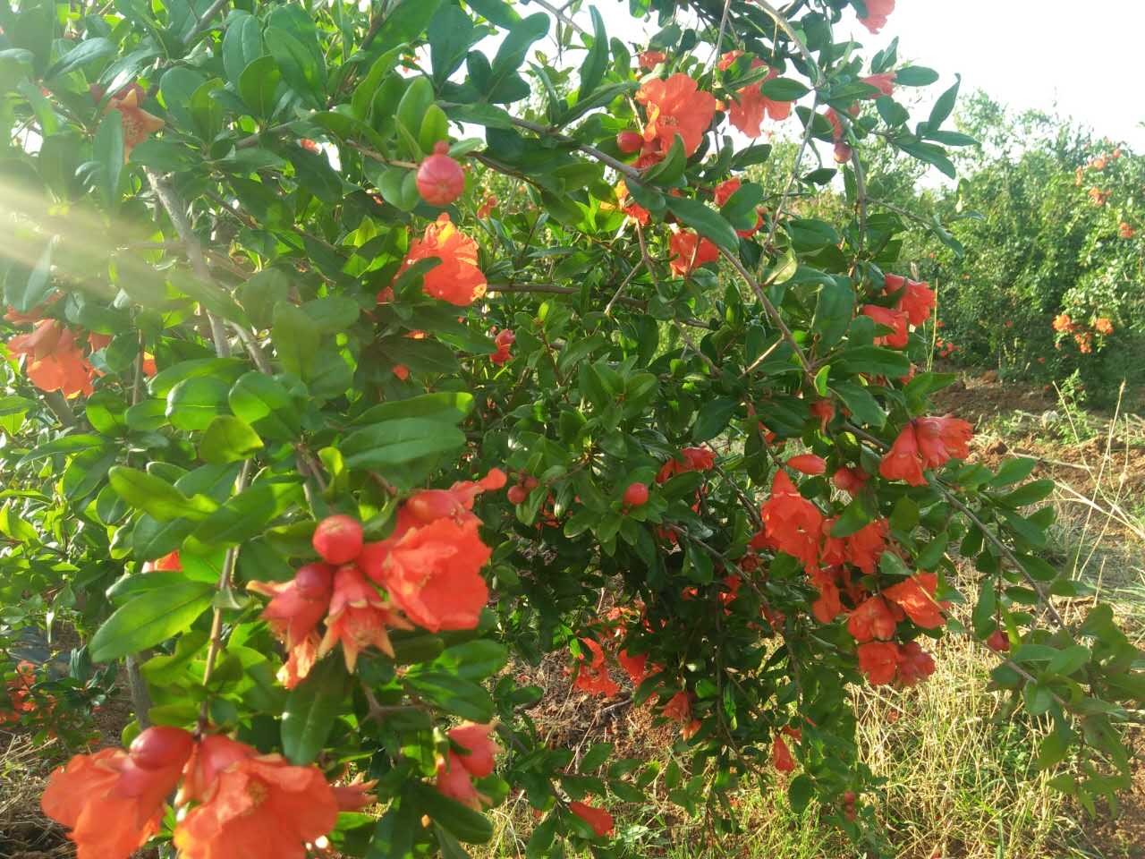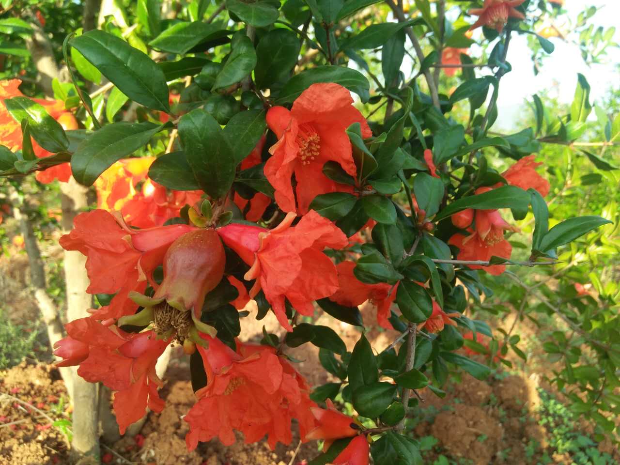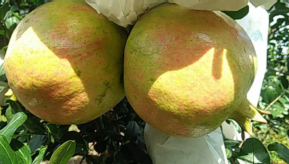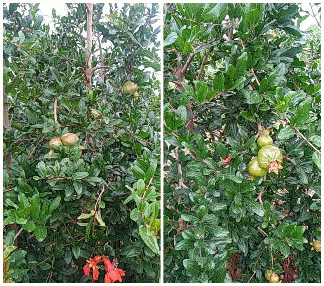 云南省宜川县金牛镇罗经理的石榴园,5月份使用了2遍痘丽净(250ml兑水200千克叶面喷施,间隔10天),半个月后观察,叶片从原来的薄、卷曲、颜色暗淡变得厚实、浓绿,发软发亮,果实饱满有光泽;7月份使用2遍果园红(250ml兑水100千克,间隔10天),目前观察到石榴上色明显,色泽红润,表皮光滑细嫩。